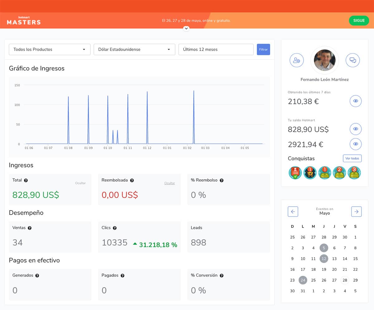 En cuanto a lo que dices (no se muy bien de donde extraes esa argumentación, ni basado en qué), que los alumnos solo ganamos dinero vendiendo el curso y no aplicando los conocimiento, he dejado unos «pantallazos» en el artículo de mi propia cuenta de Hotmart, donde se ve la evolución de mis ingresos a lo largo de este último año.